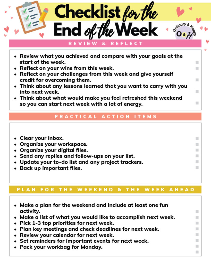 You can use our checklist for the end of the workweek in lots of ways. It gives you opportunities to reflect on the week, which is really important. You can then get inspiration from the practical ideas to get ahead for the weekend and the upcoming week.
