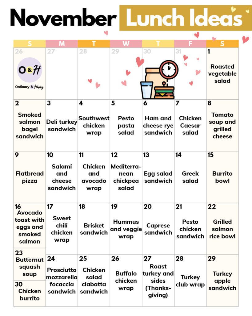 Our 30 days of lunch ideas this November, which you can get as a printable, is ideal for inspiration when you want some variety and to switch up your regular lunch options.