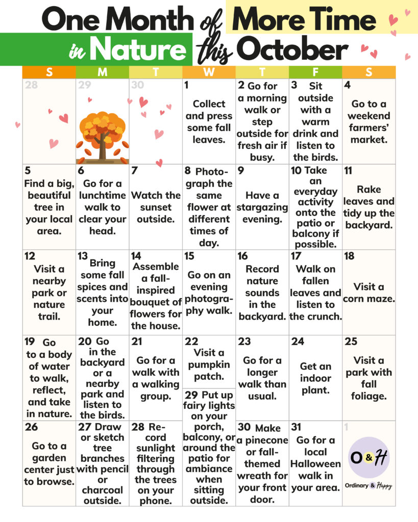 Our October ideas for having more time in nature consider the colder weather and shortening days. Many of these activities encourage you to be more present in nearby nature and your backyard. Especially with all the colors and seasonal change of fall, having time in nature can lead to some magical moments.