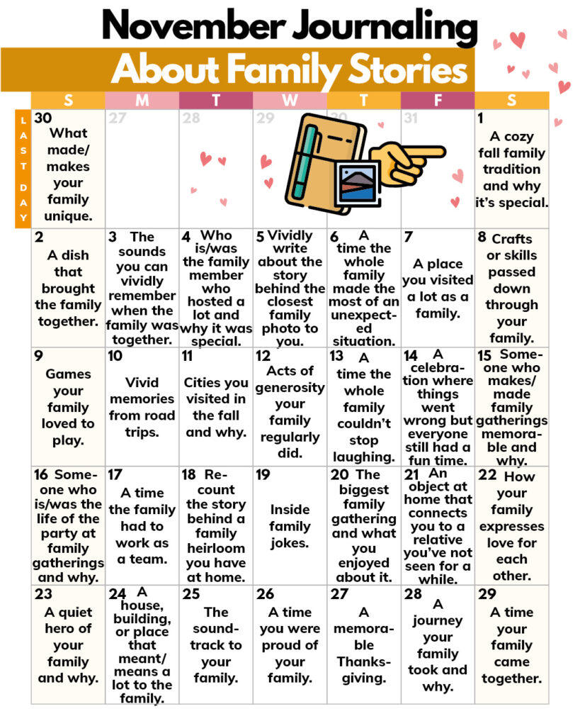 This month of journaling about family stories, especially with Thanksgiving at the end of November and the holidays to come, can connect you with some fond memories.